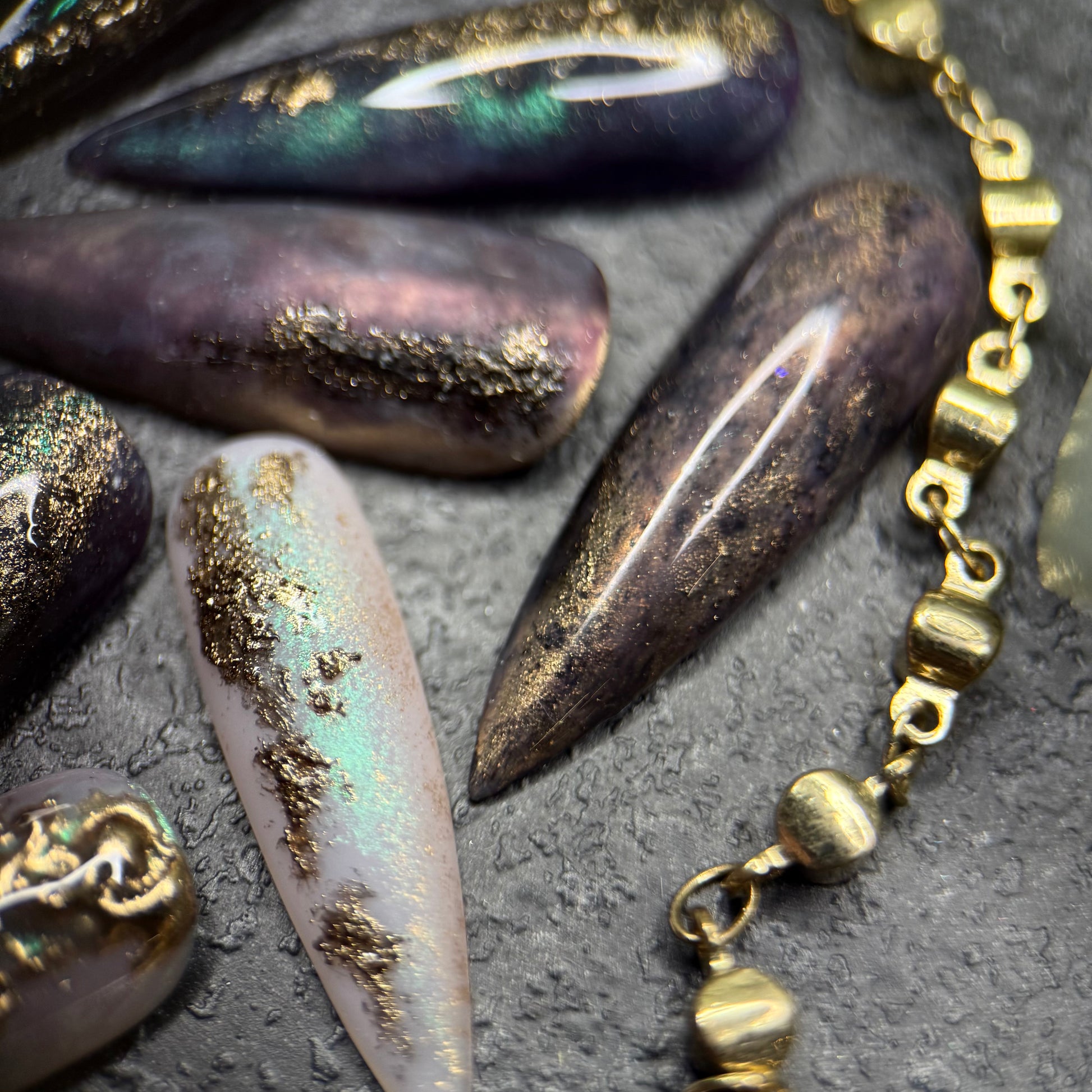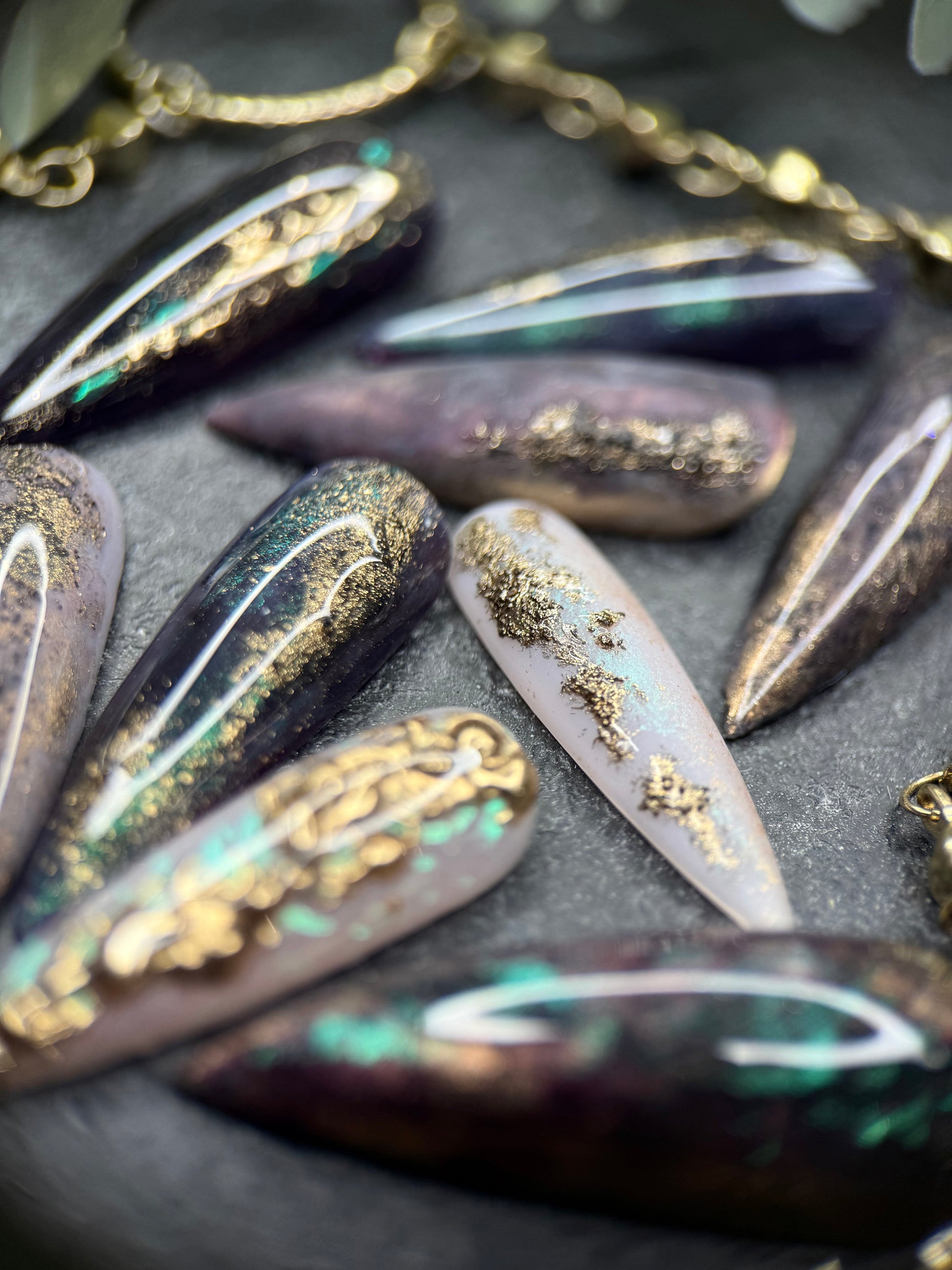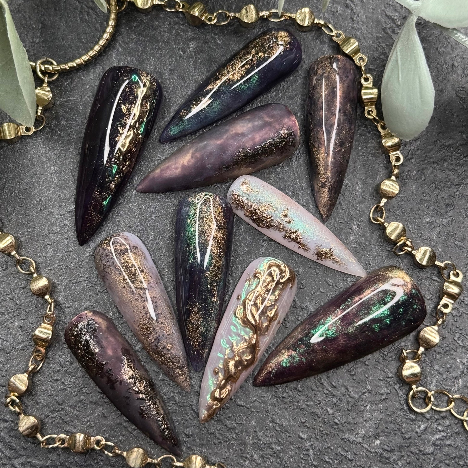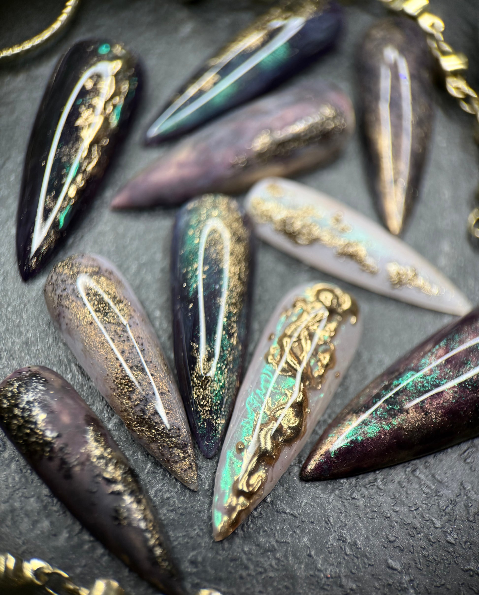 A set of 10 luxury gel false nails with a mixture of designs, featuring chrome, 3D texture, alcohol ink and layered gels