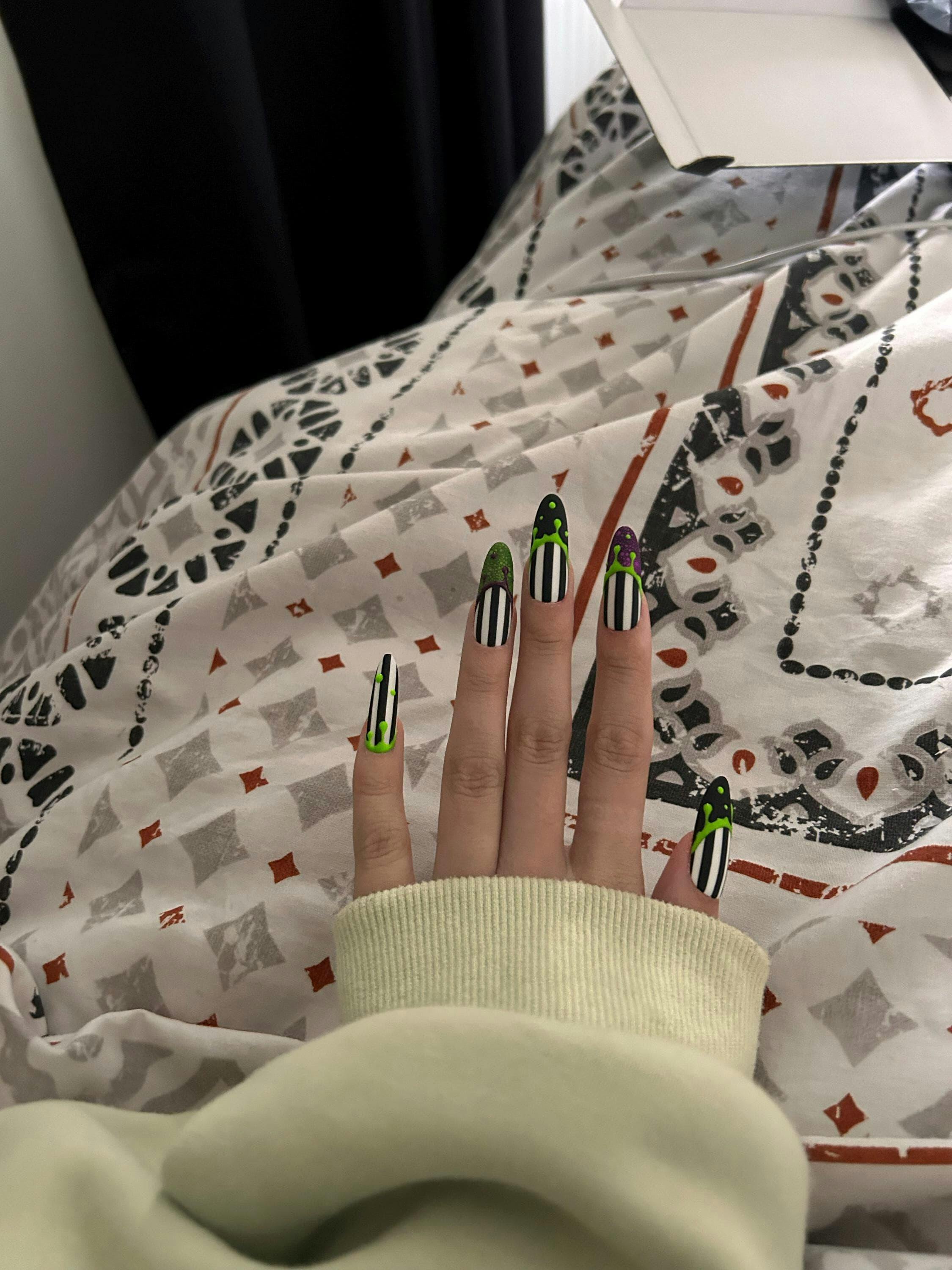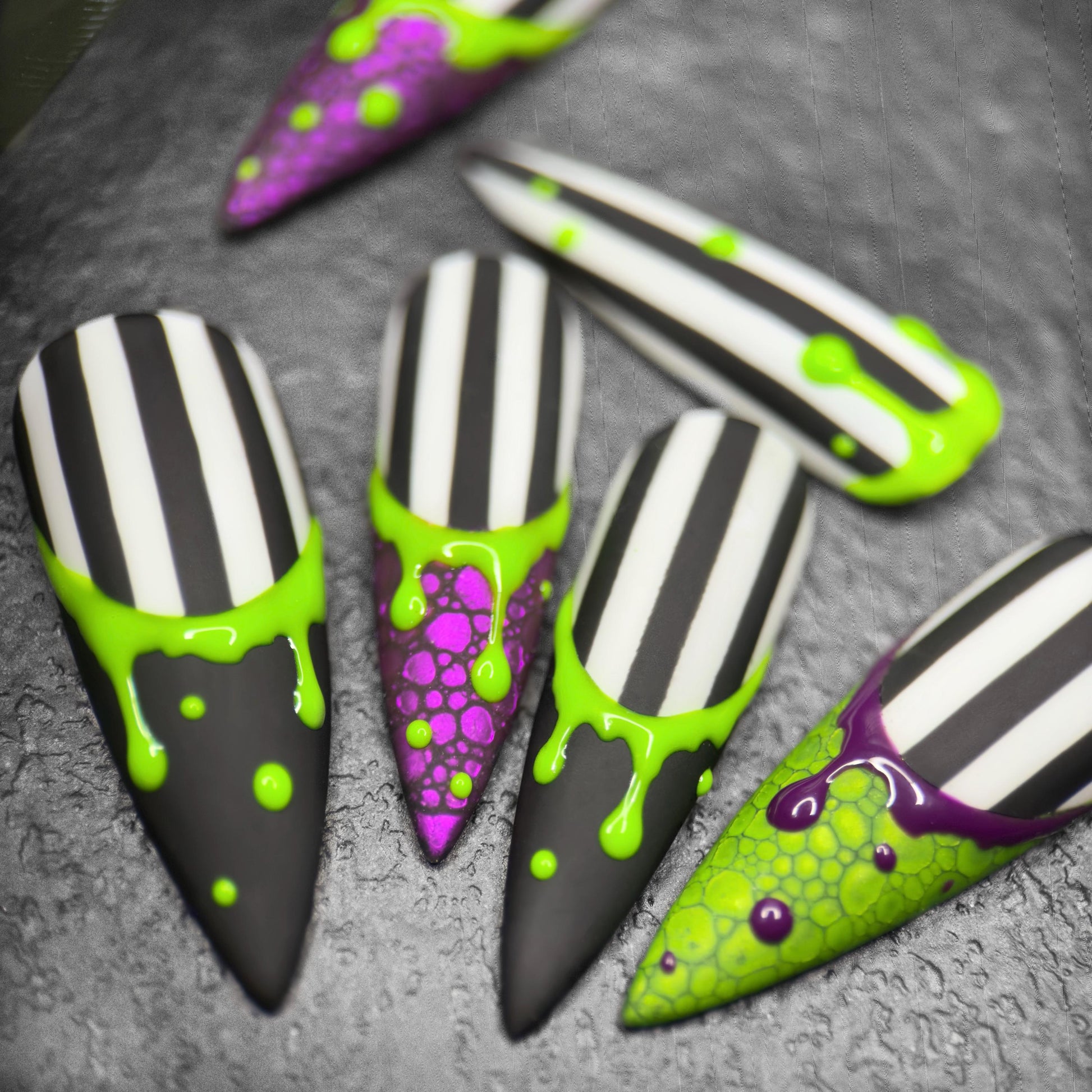 A set of 10 luxury gel false nails with a beetlejuice inspired design, featuring pinstripes, chrome, and slime effects.