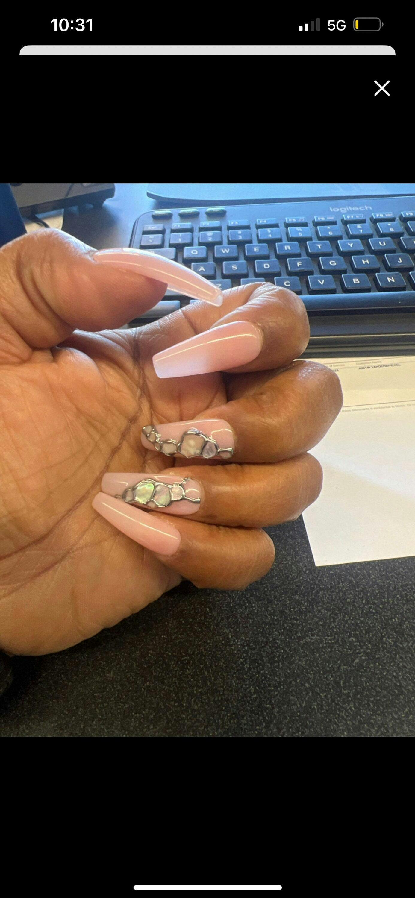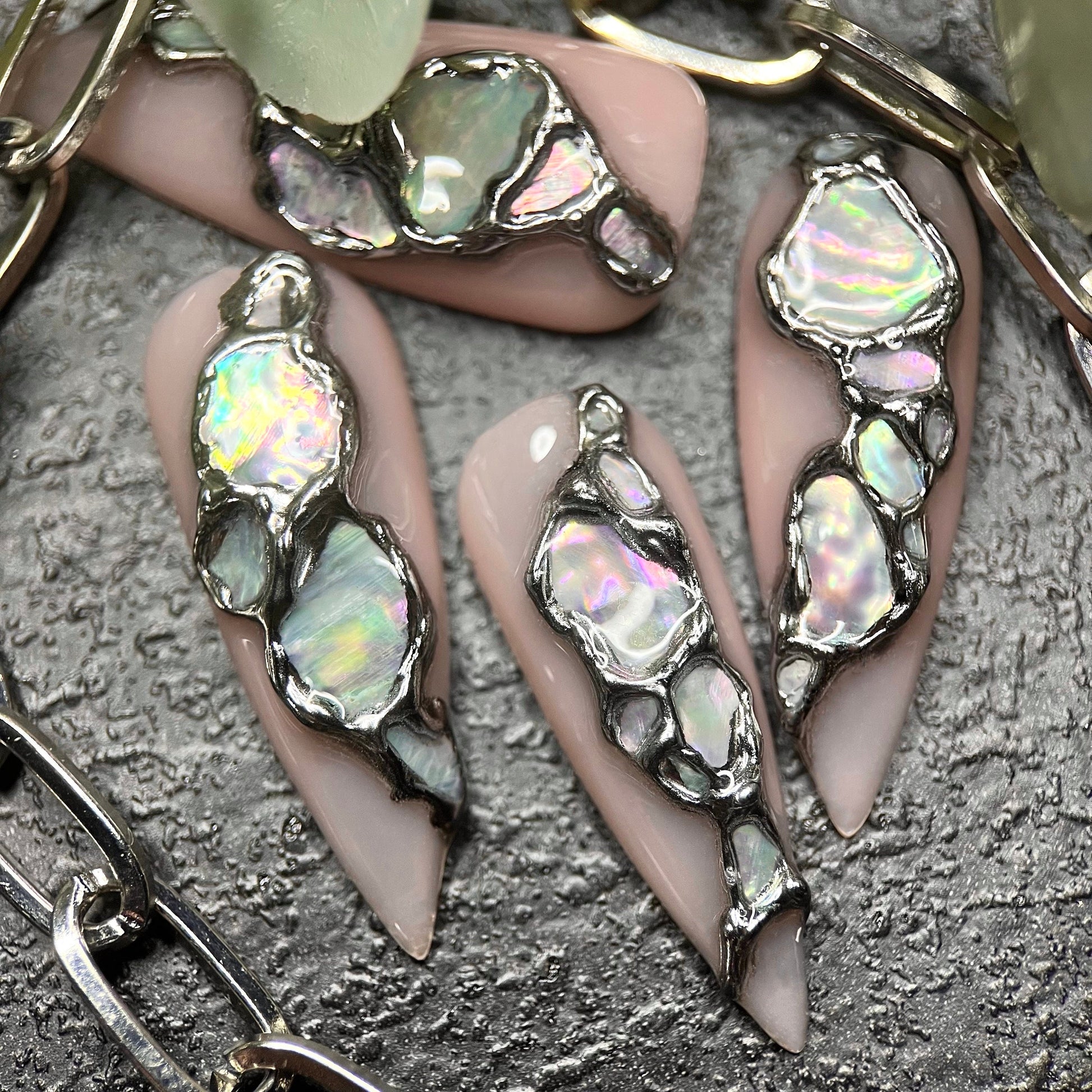 A set of 10 luxury gel false nails with customisable nude base, featuring 3D chrome detailing and real abalone shell detailing.