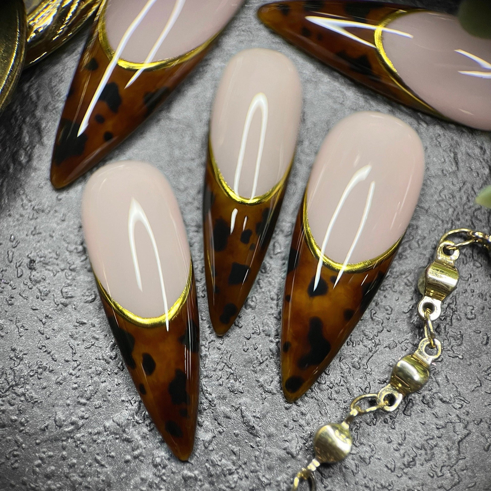 A set of 10 luxury gel false nails with a customisable nude base and tortoiseshell french, finished with gold chrome. Chrome shade can be customised.