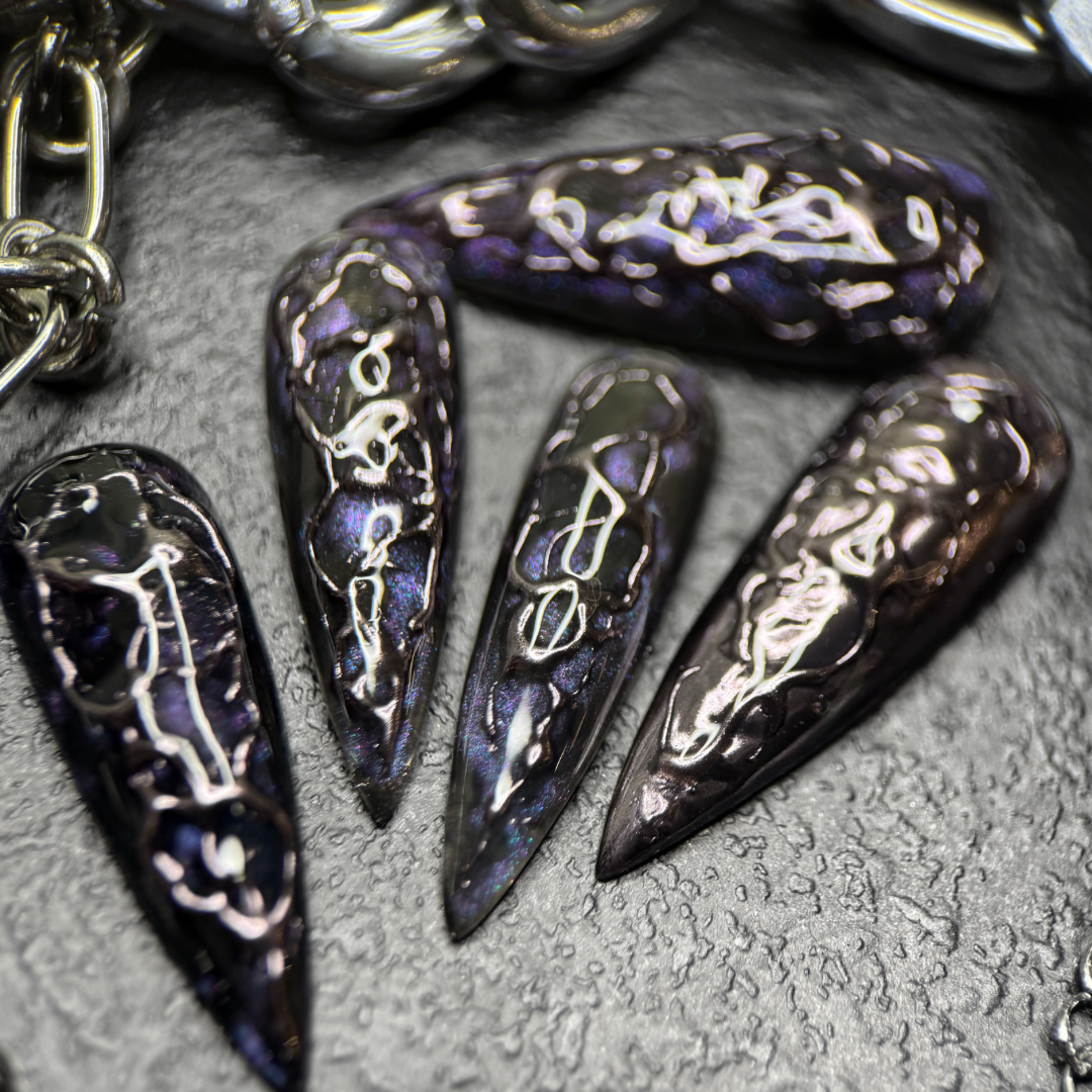 A set of 10 luxury gel false nails with a sheer purple and black cateye design, chrome detailing and solid chrome.