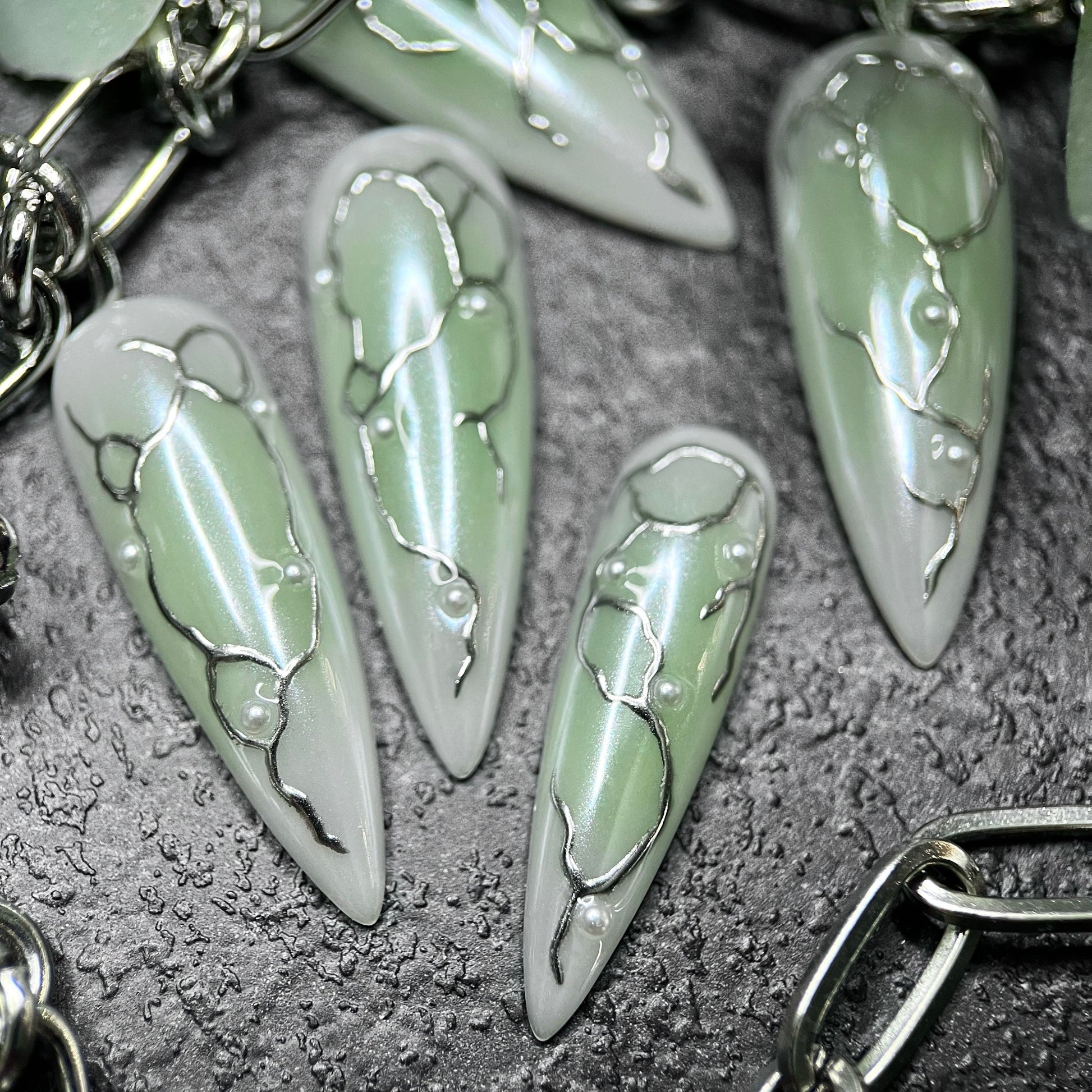A set of 10 luxury gel false nails with a milky glazed base, green aura ombre, and silver chrome abstract pattern, plus some faux pearl gems.